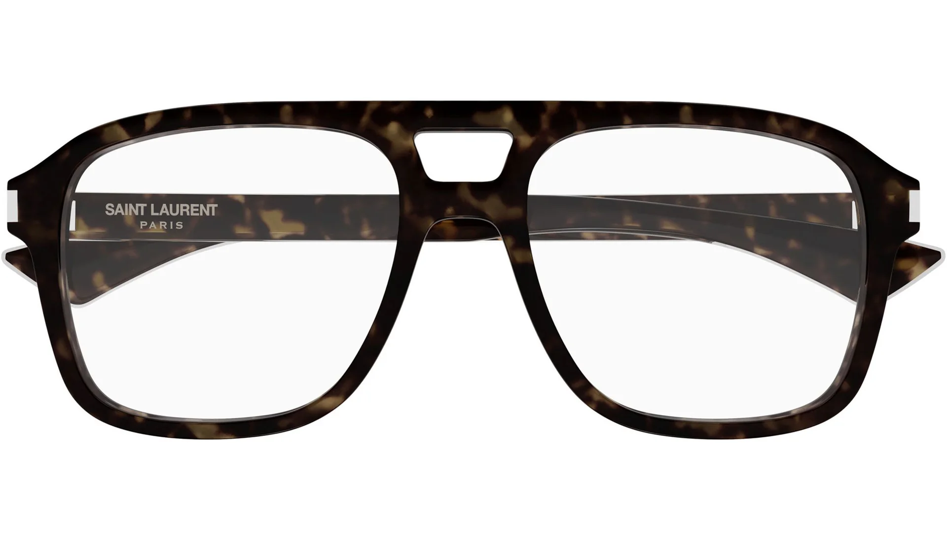 Occhiali da vista Saint Laurent SL 881 OPT 002 uomo con montatura aviatore in acetato riciclato avana scuro lucido e lenti demo. Linea: Corner Angle. Codice modello: SL 881 OPT. Codice colore: 002. Made in Japan.